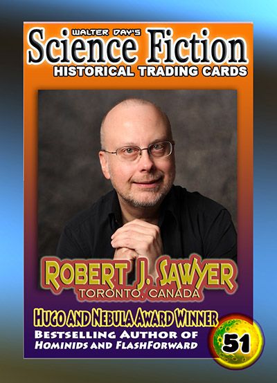 Our next Science Fiction Trading Card Spotlight features Robert J. Sawyer, who is displayed on card number 51 from the Science Fiction Collection. Rob has won the Hugo, Nebula, John W. Campbell Memorial Awards, and Aurora Awards for best novel of the year, and, according to the Locus Index to Science Fiction Awards, has won more awards as an SF/F novelist than anyone else in history. The ABC TV series FlashForward was based on his novel of the same name. In 2014, he was one of the initial nine inductees into the Canadian Science Fiction and Fantasy Hall of Fame, and in 2016 he was made a member of the Order of Canada, the highest civilian honor bestowed by the Canadian government. His 23rd novel, Quantum Night, is just out from Ace.
