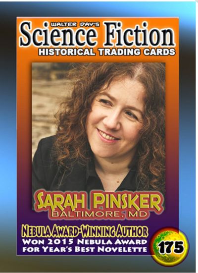 Our next Science Fiction Trading Card Spotlight features Sarah Pinsker, who is displayed on card number 175, from the Science Fiction Collection. Sarah started writing Science Fiction since she was a little kid. It wasn’t until 2012 where her career really took off. Since then she has written over 40 stories in multiple publications. She been a Nebula nominee four times and won in 2015 for best Novelette. Her fiction has been translated into a half a dozen language. Her next project, “Sooner or Later everything falls into the Sea”, will be published in 2019.
