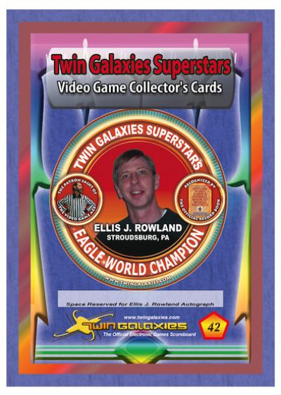Our next Trading Card Spotlight features Ellis Rowland, who is displayed on card number 42, from the Superstars of 2011 Collection. Ellis is proud of his world record at the arcade game Eagle. His score of 274,970 was posted on the leaderboard on July 16, 2011 and no one has beat it since. Growing up in the arcade boom of the 80’s, Ellis played a lot of Asteroids. He has posted some others score on arcade games such as Bump N’ Jump and Defender. He also added a high score on Mario Kart for the Nintendo Wii. Living in New Jersey, Ellis remains involved in the gaming scene through his son, who he takes to gaming tournaments and roots him on.