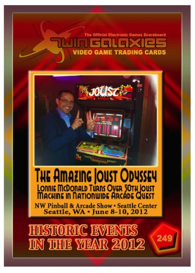 Our next Trading Card Spotlight features Lonnie McDonald who currently is displayed on card number 249, from the Superstars of 2012 Collection. He is also featured on cards 127 (with Steve Sanders), 589, 905, 1442 and 1465. Steve is one greatest Joust players. He was in Ottumwa, IA in 2012 setting a Joust MAME world record and was the first person to play in the original Twin Galaxies location since the mid 1980's. Lonnie is one of only 3 people to break the 1 million point barrier on the Joust Arcade game in Tournament Settings. He is the only person over the age of 50 to marathon a game 50 hours straight. Between 2011 and 2013 Lonnie went on a tour to roll the Joust score on as many arcade machines as he could. On June 10th, 2012, Lonnie rolled the score on his 50th Joust Machine. On May 23rd, 2013, Lonnie rolled his 100th machine. Along with Steve Sanders, Lonnie broke another record by competing in a doubles marathon and playing Joust with Steve for over 15 hours straight. Their score of 40,120,150 is also a doubles record. Lonnie has also promoted vintage gaming for TV, magazine, newspapers and online as well as supported numerous charities to help fellow gamers