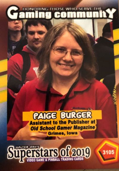 Our next Trading Card Spotlight features Paige Burger, who is displayed on card number 3105, from the Superstars of 2019 Collection. Paige is part of the Old School Gamer Magazine crew. Daughter of the creator and publisher, Paige has made a huge impact on promoting and signing up gamers for the magazine. She travels to many of the conferences and works the OSG booth and is always excited to meet new people and explain the positive reasons to join the Old School subscribers. Chances are when you see the Old School Gamer booth at your event, she will be there with all smiles.