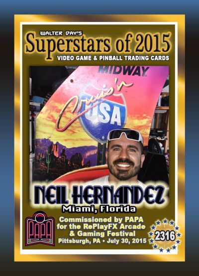 Our next Trading Card Spotlight features Neil Hernandez who is displayed on card number 2316, from the Superstars of 2015 Collection. Neil is a masterful arcade technician who has come to the rescue for numerous arcades across the country. His skills are praised by some of the biggest arcade owners around. Based in Florida, Neil has a passion for collecting the arcade machines that have become historical in the gaming community. His passion of gaming goes beyond fixing arcades as Neil holds arcade world records on such games as Crius’n USA and Off-Road Challenge. He has many goals, but one is to break the Galaga – Fast Shot arcade record. If you look hard during Billy Mitchell arcade streams, you may see Neil pop up and chat with the online gamers.