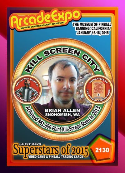 Our next Trading Card Spotlight features Brian Allen, who currently is displayed on card number 329, from the Superstars of 2012 Collection. Brian is also featured on cards 2130 and 2466. Brian is considered one of the best Donkey Kong and Donkey Kong Junior players in the world. He has accomplished the well-known ‘Kill Screen’ many times in Donkey Kong. He has his name in the record books for Donkey Kong Jr and Donkey Kong 3. Brian has had a personal tournament named after him called the ‘Allen-Off”. This battle between Allen Staal of Australia and Brian Allen of the U.S. Look for Brian at some of the Kong Off tournament, as he will surely be up there in the rankings.