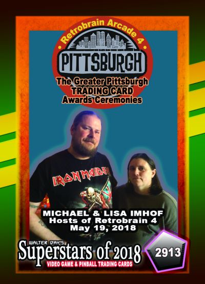 Our next Trading Card Spotlight features Mike Imhof, who is displayed on card number 2712, from the Superstars of 2017. Mike and his wife Lisa are also on trading card number 2913. Along with his wife, Mike has a home arcade in Pittsburgh, PA called “RetroBrain Arcade”. Each year Mike hosts an annual home arcade party. Dozens of gaming enthusiasts come out to participate in this family friendly competition. For over a decade now, Mike has been collecting retro and modern-day consoles, pinball machines and arcade video games to share among the community. The reason Mike does this unselfishly is because he remembers going to an arcade with a group of friends and sharing the experience with others. He loves to recreate that feeling again in his home arcade.