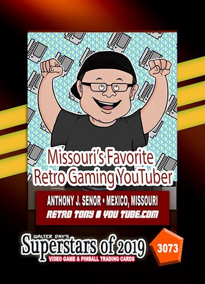 Our next Trading Card Spotlight features Tony Senor who is displayed on card number 3073, from the Superstars of 2019 Collection. Tony is a YouTuber personality that covers all things related to retro video gaming. In his videos you can see him retro game hunting and doing tours of video game stores. He also has a series called “Retro and the Bubbys” and he covers events like the Missouri Game Con and Retropalooza hosted by the Game Chasers. Tony is also a collector with over 6,000 video games in his collection. Tony also enjoys reviewing various video games that he played from his youth from the Atari 2600 to modern-day. One of Tony’s goals is to cover every arcade and video store in his home state of Missouri. You can check out his Facebook page by clicking here.