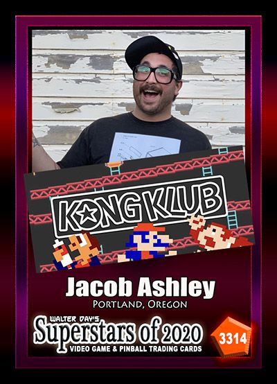 Our next Trading Card Spotlight features Jacob Ashley, who currently is displayed on card number 3314 from the Superstars of 2020 Collection. Jacob is an arcade collector, video game developer and artist. He is co-creator of the ‘Kong Klub’. Since 2016, it is the largest forum group of gamers who collect Donkey Kong arcade machines. One of Jacob’s hidden talent is creating wooden video game art that he did from 2009-2019. The group was called ‘The Wooden Arcade’. His personal page, MegaSuperRad keeps him plenty busy as well as a full time Twitch streamer.