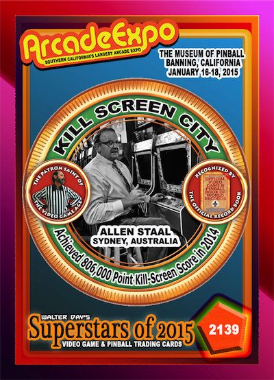 Our next Trading Card Spotlight features Allen Staal who currently is displayed on card number 392, from the Superstars of 2012 Collection. You can also see Allen on card numbers 1754, 2139, 2173, 2467, and 2597. Allen is a huge Donkey Kong fan, as well as a competitive player. He has traveled a couple times from his home in Australia to compete against the best in the world at the Kong Off. Allen is the first Australian ever to beat Donkey Kong with a kill screen 10 times. You can see Allen streaming his games on Twitch as well as YouTube. Allen has grown many friendships over the past years and still looks forward to seeing everyone at events.