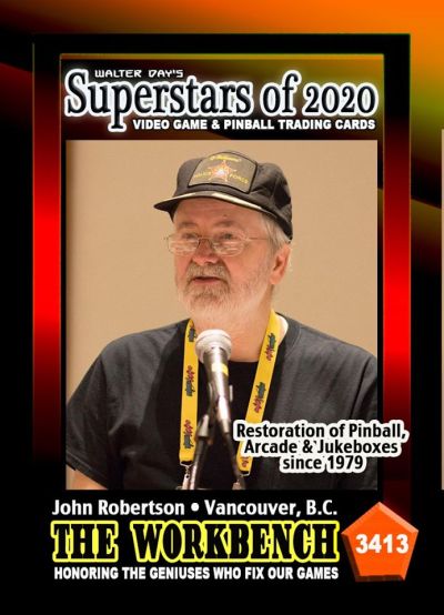 Our next Trading Card Spotlight features John Robertson who is displayed on card number 3413, from the Superstars of 2020 Collection. John is an extraordinary pinball restorationist. He has been repairing pinball machines since the 1970’s. He is passionate about his work and hates call backs so his shop tries to ensure that game repairs last a long time so they do not need to be looked at again. His expertise has been documented in many magazines and he loves to share his tips about fixing a pinball machine. He is the president of John’s Jukes’ Ltd., located in Canada.