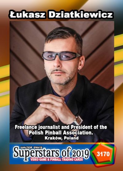 Our next Trading Card Spotlight features Łukasz Dziatkiewicz who currently is displayed on card number 3170, from the Superstars of 2019 Collection. Łukasz is a freelance journalist, President of the Polish Pinball Association (PSF), IFPA Polish Country Director and a partner of the Jersey Jack Pinball Flipper Club in Bytom. As an expert, Łukasz has appeared on radio and TV dozens of times to discuss his pinball views. Łukasz has a huge billiard collection - collection of over hundreds of objects includes pictures, advertisements, documents, postcards, prints, posters, models, games and accessories, etc. even some billiard tables. Part of the collection are bagatelles, including real billiard bagatelle, which is a pinball forerunner. You can find Łukasz on many different websites including Flippery.com.pl | Polskie Stowarzyszenie Flipperowe.