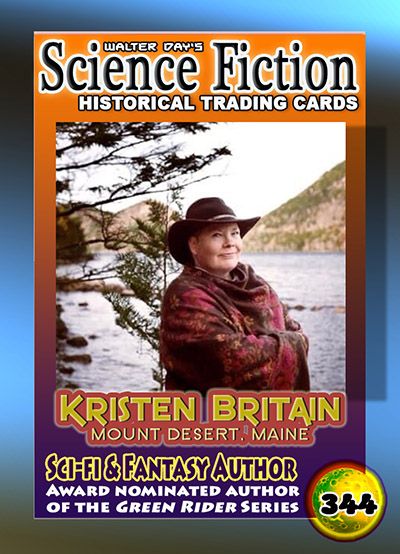 Our next Science Fiction Trading Card Spotlight Features Kristen Britain who is displayed on card number 344, from the Walter Day Science Fiction Collection. Kristen is the author of the New York Times bestselling Green Rider Series and several works of short fiction, nonfiction, and poetry. She has worked as a National Park Service ranger. In 2003, she concluded her Park Service career at Arcadia as the park’s writer-editor to pursue fiction writing full time. She currently works fulltime as a writer of fantasy novels and short stories.