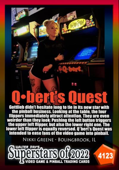 Our next Trading Card Spotlight features Nikki Greene, who currently is displayed on card number 4123, from the Superstars of 2022 Collection. Nikki is an all-around gamer that enjoys anything and everything about gaming. Her love is typically playing arcade or pinball machines. She started her own team with the Pinball Chicago League, called the “Bad News Babes”. Her all-time favorite gaming character is Q*Bert, and she has a massive collection of items having to do with Q*Bert. She continues to search and hunt down rare items that she can add to the collection. You most likely can find Nikki hopping between Chicago and Los Angeles, playing games, going to conventions and being an all-around cool person to hang out with.