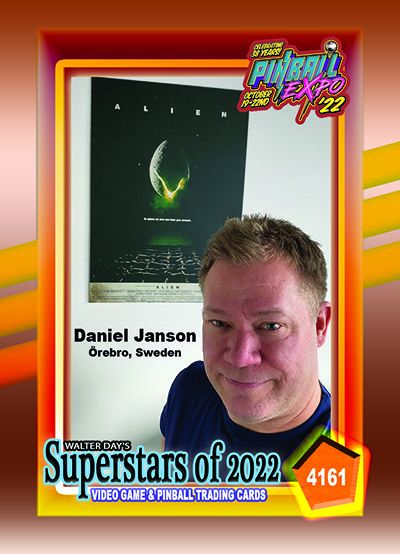 Our next Trading Card Spotlight features Daniel Janson who is displayed on card number 4161, from the Superstars of 2022 Collection. Daniel has been into pinball since I was 12-13 years old. In 2003, he purchased his first pinball machine (The Shadow). This was the starting point of collecting and restoring pinball machines, something Daniel had done ever since. He founded an online pinball spare parts shop in 2012, Free Play, mainly to help pinball restorers finding parts in the Nordics. Daniel was one of the founders of Pinball Brothers with a mission to save the Alien project, which they eventually did. Since January 2022 he has been appointed CEO for the company.