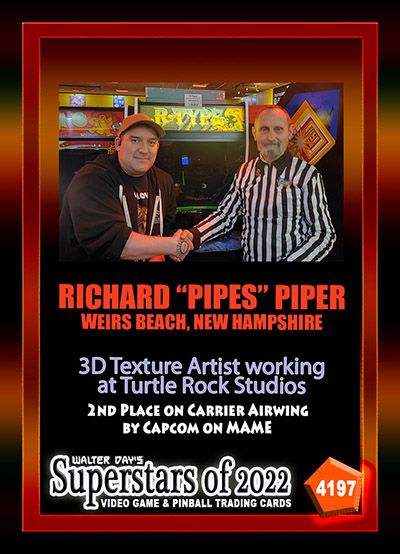 Our next Trading Card Spotlight features Richard “Pipes” Piper, who is displayed on card number 4197, from the Superstars of 2022 Collection. Richard has been an avid gamer since the Atari 2600 was released. He always loved arcade games and he is finally creating his own home arcade in New Hampshire. He holds 2nd place on Carrier Airwing by Capcom on Mame. He previously worked for Naughty Dog on Last of Us 2 and Uncharted 4 and Lost Legacy. Prior to Naughty Dog he worked on the following Lego Games: Lego Star Wars Clone Wars and Lego City Undercover.