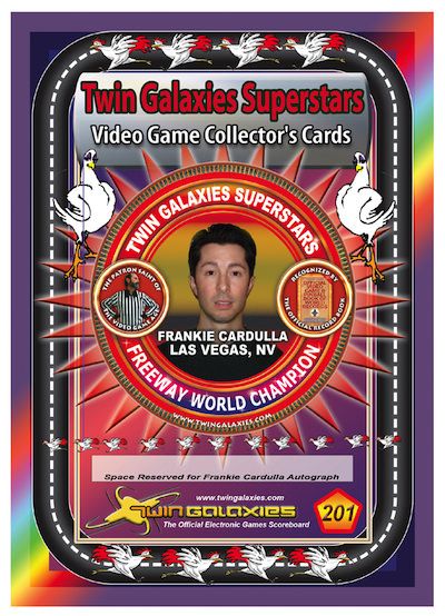 Our next Trading Card Spotlight features Frankie Cardulla who is displayed on card number 201, from the Twin Galaxies Superstars Collection of 2012. When it comes to Atari, Frankie is one of the best. Back in the 1980s, Frankie competed in major Atari tournaments such as Space Invaders and Asteroids. At one time Frankie played Asteroids in the arcade for 40 hours straight. You can see some of his Atari world records on the Twin Galaxies scoreboard. Some of the games he holds world records on are Pole Position, Atlantis, Defender, and Freeway.