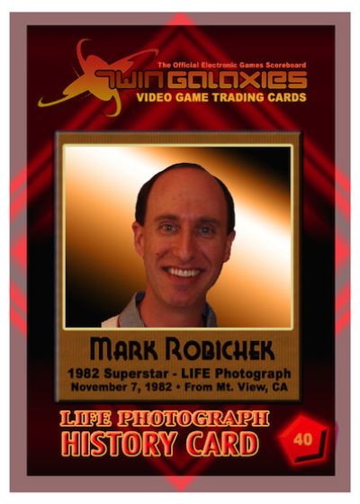 Our next Trading Card Spotlight features Mark Robichek who is displayed on card number 40, from the Superstars of 2011 Collection. Mark is another original Twin Galaxies alumnus from 1982. He can be seen alongside the greats in the Time Life Magazine photograph taken on November 7, 1982. Mark early on set the bar for world records on such arcade games as Frogger, Tutankham and Berzerk. Today Mark can be seen playing Pengo on MAME or smart phone games such as Words with Friends and What’s That Phrase. Currently Mark is a Casino Party Dealer and resides in Sunnyvale, California.