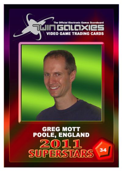 Our next Trading Card Spotlight features Greg Mott, who is displayed on card number 34, from the Superstars of 2011. Greg has been around the gaming scene since 1999 when he joined UKvac group on line and first met up with other UK collectors. He holds a record on the Buster Bros. Arcade game with a score of 2,228,150. Not only is Greg a major competitor for arcades in home country of England, he also competes in pinball tournaments and is highly regarded as one on the greatest gaming competitors in England.