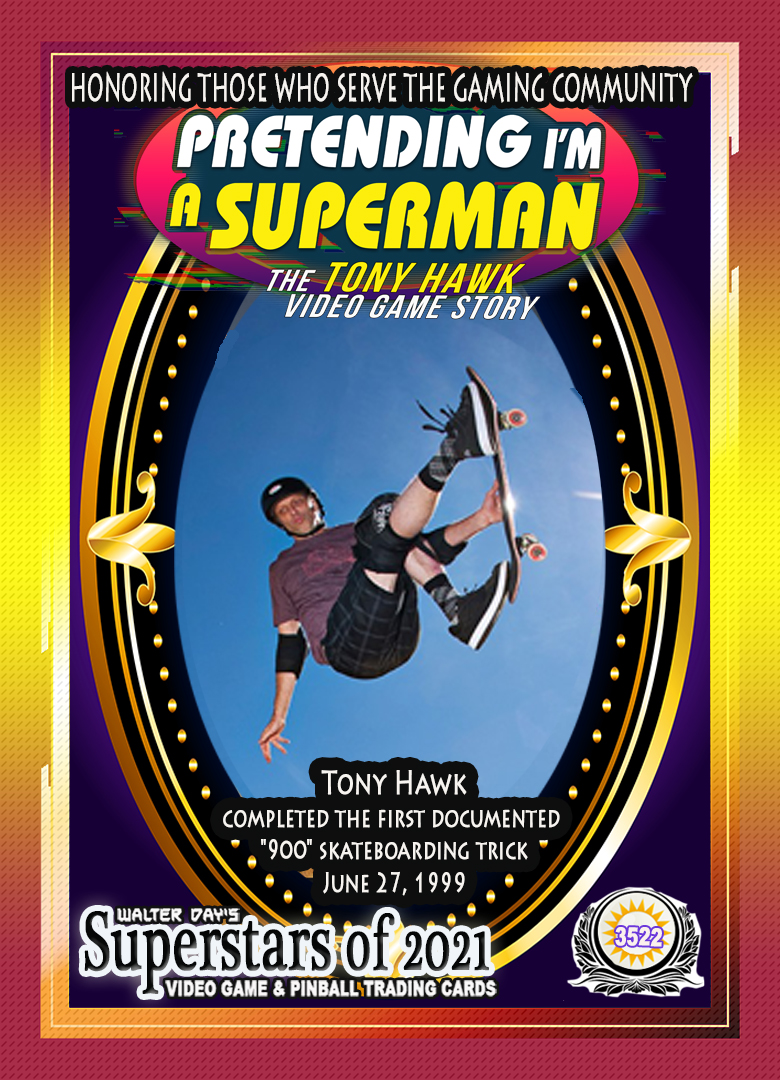 Our next Trading Card Spotlight features Tony Hawk who currently is displayed on card number 3522, from the Superstars of 2021 Collection. There is no talk about skateboarding without mentioning the name Tony Hawk. His popularity in skateboarding was as big as any other top names in professional sports. He was the first person ever to land a “900”, a maneuver he was trying for almost 10 years. This feat was accomplished right at the time that Tony stepped into the video game industry with the franchise of Tony Hawk’s Pro Skater. The Tony Hawk video game series became one of the most popular franchises in history and has surpassed 1.4 billion dollars in sales. In December 4, 2020, a documentary of the Tony Hawk gaming series was released, “Pretending I’m a Superman – The Tony Hawk Video Game Story”.