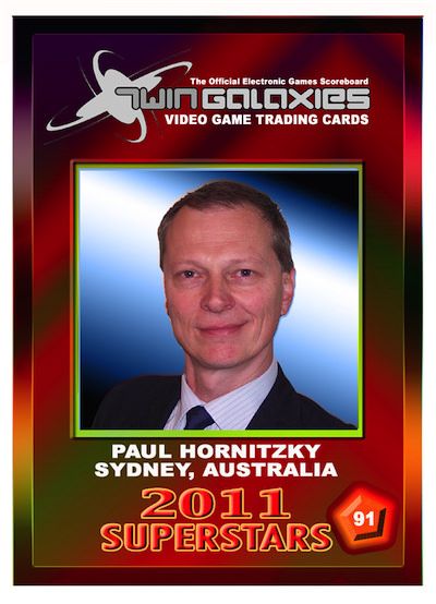 Our next Trading Card Spotlight features Paul Hornitzky who is displayed on card number 91, from the Twin Galaxies Superstars Collection of 2011. Paul is also on card number 3030. Paul grew up in the Golden Age of Video Games. When Arcades and Pinball were all the rage back in the 1970s and 1980s. Paul would go on to break world records on such games as Discs of Tron, Pengo, and Blaster. Paul is from Australia and finds time to game with his call sign of “OOO”.