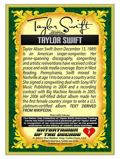 Other Notes: "The TAYLOR SWIFT HISTORICAL TRADING CARD set is a personal art project created by Walter Day to honor the world's most talented performer. Though many sets of the cards have been sent directly to Taylor and her family, the card set can't be distributed to the public because the images and text are unauthorized and violate copyright laws. So, the set must remain in the realm of artistic expression."