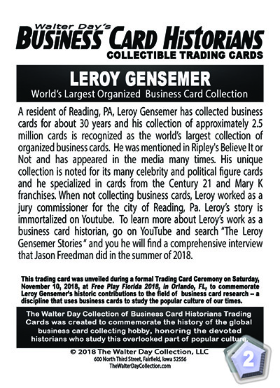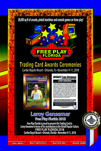 This trading card and trading card award were presented on Saturday, Saturday, November 10, 2018, during the 2018 FREE PLAY FLORIDA TRADING CARD AWARDS CEREMONIES at the Caribe Royale Resort in Orlando, Florida, in recognition of important contributions in the field of business card history.