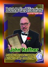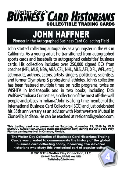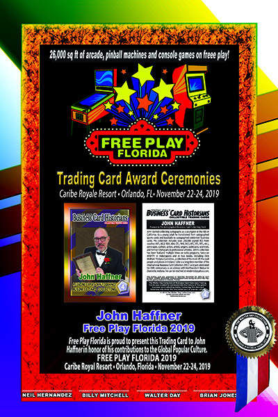 This trading card and trading card award were presented on Saturday, November 23, 2019, during the 2019 FREE PLAY FLORIDA gaming festival in Orlando, Florida in recognition of important contributions in the field of business card history.