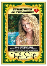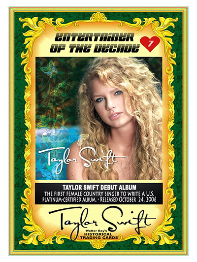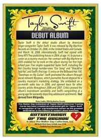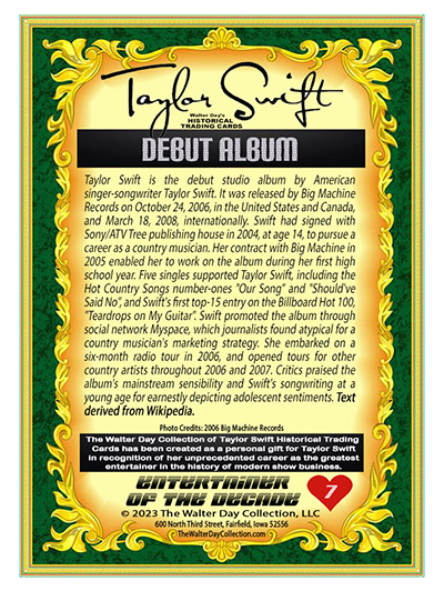 Other Notes: "The TAYLOR SWIFT HISTORICAL TRADING CARD set is a personal art project created by Walter Day to honor the world's most talented performer. Though many sets of the cards have been sent directly to Taylor and her family, the card set can't be distributed to the public because the images and text are unauthorized and violate copyright laws. So, the set must remain in the realm of artistic expression."