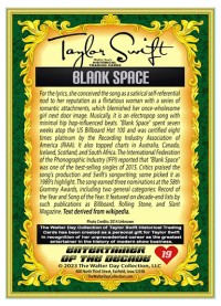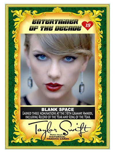 Other Notes: "The TAYLOR SWIFT HISTORICAL TRADING CARD set is a personal art project created by Walter Day to honor the world's most talented performer. Though many sets of the cards have been sent directly to Taylor and her family, the card set can't be distributed to the public because the images and text are unauthorized and violate copyright laws. So, the set must remain in the realm of artistic expression."