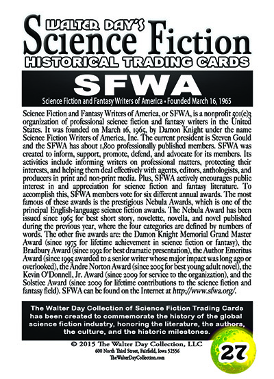 About 115 copies of this prototype card were printed before the SFWA asked for some minor changes in the backside text. Of course, no more copies of this prototype card will be printed. On this prototype edition, the fifth line of text says: "and the SFWA has about 1,800 professionally published members."