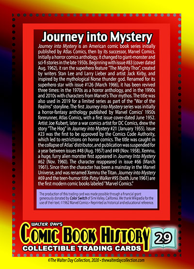 The production of this trading card was made possible through a financial grant generously donated by Color Switch of Simi Valley, California. ©1962 Marvel Comics • Reprinted as historical and educational reference.