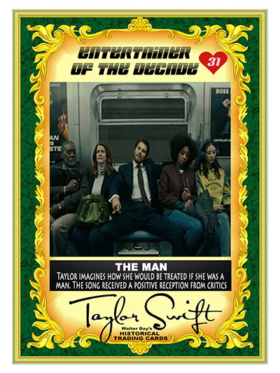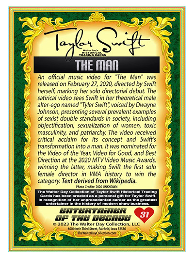 Other Notes: "The TAYLOR SWIFT HISTORICAL TRADING CARD set is a personal art project created by Walter Day to honor the world's most talented performer. Though many sets of the cards have been sent directly to Taylor and her family, the card set can't be distributed to the public because the images and text are unauthorized and violate copyright laws. So, the set must remain in the realm of artistic expression."