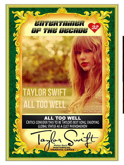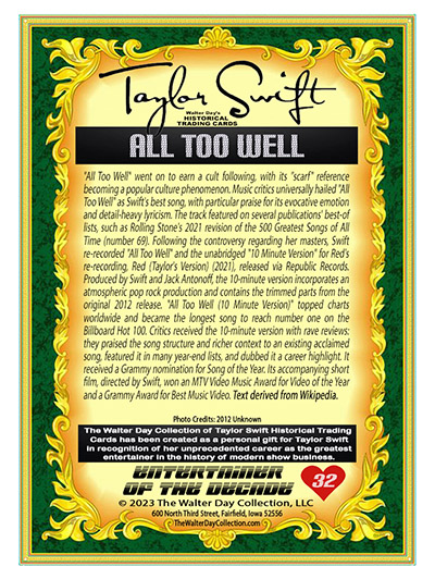 Other Notes: "The TAYLOR SWIFT HISTORICAL TRADING CARD set is a personal art project created by Walter Day to honor the world's most talented performer. Though many sets of the cards have been sent directly to Taylor and her family, the card set can't be distributed to the public because the images and text are unauthorized and violate copyright laws. So, the set must remain in the realm of artistic expression."