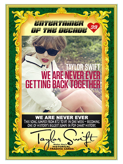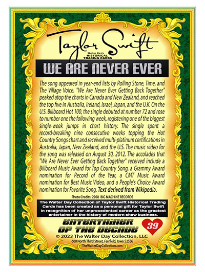 "The TAYLOR SWIFT HISTORICAL TRADING CARD set is a personal art project created by Walter Day to honor the world's most talented performer. Though many sets of the cards have been sent directly to Taylor and her family, the card set can't be distributed to the public because the images and text are unauthorized and violate copyright laws. So, the set must remain in the realm of artistic expression."