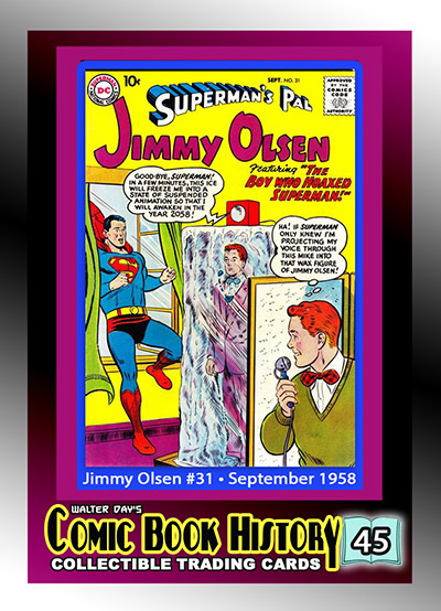 Jimmy Olsen - #31 • ©1958 (September 1958) DC Comics. • Reprinted for educational and historical purposes and for research. The production of this trading card was made possible through a financial grant generously donated by Robert Racek/Sid of Team ScoreChasers. (Www.retroexperiences.com).