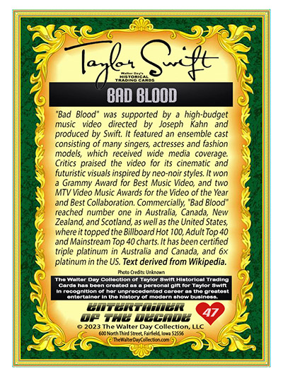 "The TAYLOR SWIFT HISTORICAL TRADING CARD set is a personal art project created by Walter Day to honor the world's most talented performer. Though many sets of the cards have been sent directly to Taylor and her family, the card set can't be distributed to the public because the images and text are unauthorized and violate copyright laws. So, the set must remain in the realm of artistic expression."