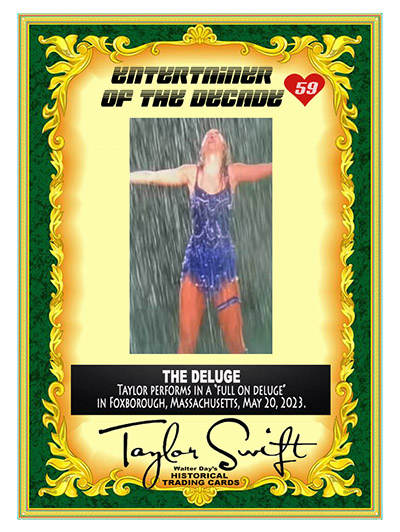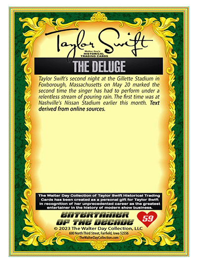 Other Notes: "The TAYLOR SWIFT HISTORICAL TRADING CARD set is a personal art project created by Walter Day to honor the world's most talented performer. Though many sets of the cards have been sent directly to Taylor and her family, the card set can't be distributed to the public because the images and text are unauthorized and violate copyright laws. So, the set must remain in the realm of artistic expression."