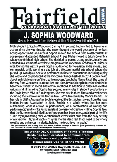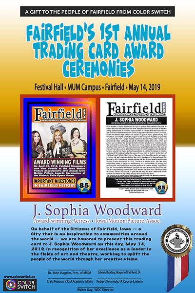 This trading card and award were presented during FAIRFIELD'S 1ST ANNUAL TRADING CARD AWARD CEREMONIES, held in Festival Hall, Argiro Center, MUM Campus, Fairfield, Iowa, on Tuesday, May 14, 2019.