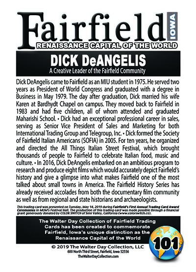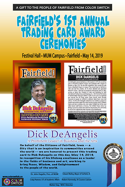 This trading card and award were presented during FAIRFIELD'S 1ST ANNUAL TRADING CARD AWARD CEREMONIES, held in Festival Hall, Argiro Center, MUM Campus, Fairfield, Iowa, on Tuesday, May 14, 2019.