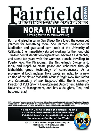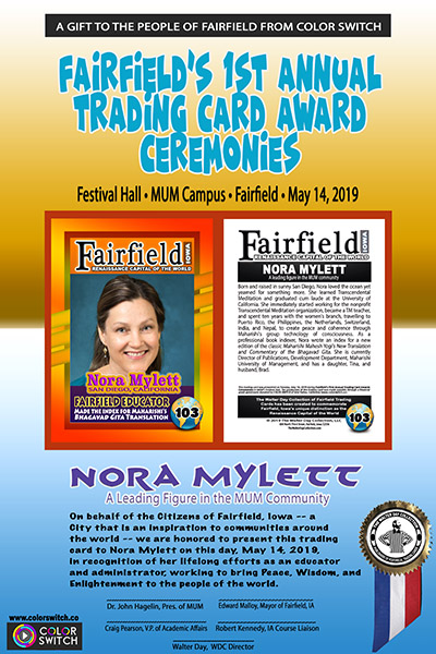 This trading card and award were presented during FAIRFIELD'S 1ST ANNUAL TRADING CARD AWARD CEREMONIES, held in Festival Hall, Argiro Center, MUM Campus, Fairfield, Iowa, on Tuesday, May 14, 2019.