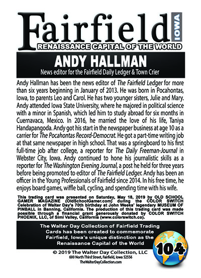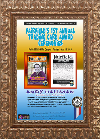 This trading card and award were presented during FAIRFIELD'S 1ST ANNUAL TRADING CARD AWARD CEREMONIES, held in Festival Hall, Argiro Center, MUM Campus, Fairfield, Iowa, on Tuesday, May 14, 2019.