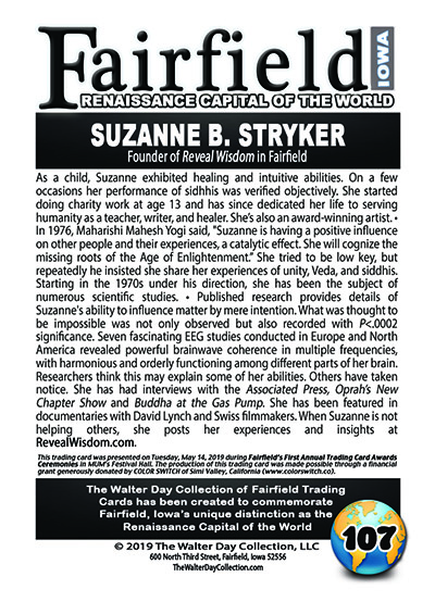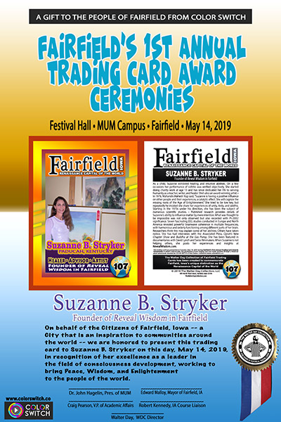 This trading card and award were presented during FAIRFIELD'S 1ST ANNUAL TRADING CARD AWARD CEREMONIES, held in Festival Hall, Argiro Center, MUM Campus, Fairfield, Iowa, on Tuesday, May 14, 2019.