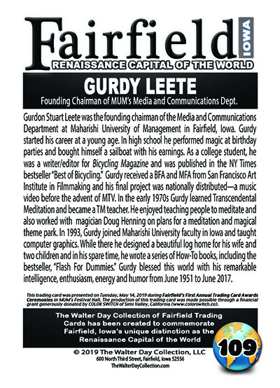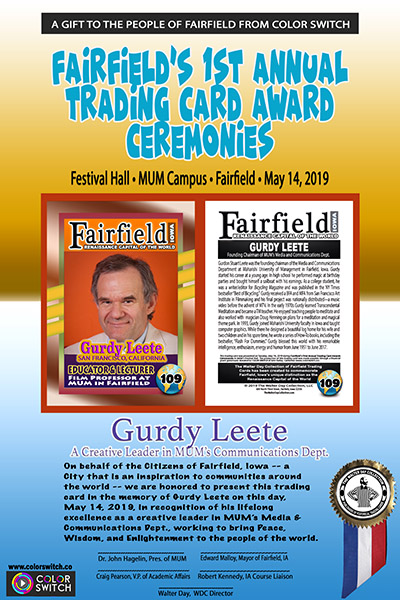 This trading card and award were presented during FAIRFIELD'S 1ST ANNUAL TRADING CARD AWARD CEREMONIES, held in Festival Hall, Argiro Center, MUM Campus, Fairfield, Iowa, on Tuesday, May 14, 2019.