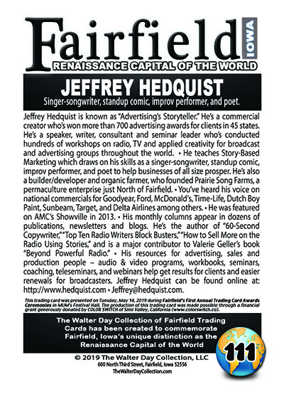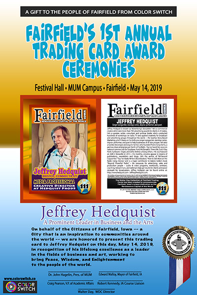 This trading card and award were presented during FAIRFIELD'S 1ST ANNUAL TRADING CARD AWARD CEREMONIES, held in Festival Hall, Argiro Center, MUM Campus, Fairfield, Iowa, on Tuesday, May 14, 2019.