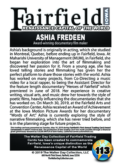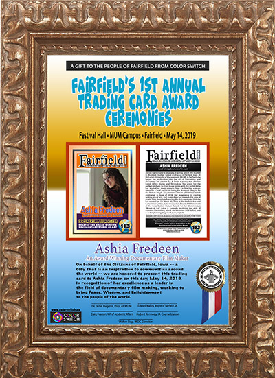 This trading card and award were presented during FAIRFIELD'S 1ST ANNUAL TRADING CARD AWARD CEREMONIES, held in Festival Hall, Argiro Center, MUM Campus, Fairfield, Iowa, on Tuesday, May 14, 2019.