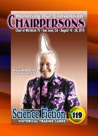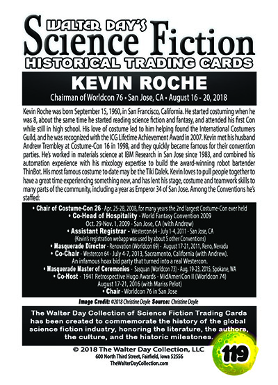 This card and award were unveiled at Worldcon 76, on FrIday, August 17, 2018, at the San Jose McEnery Convention Center. This card was created in recognition of Kevin Roche's immense contributions to the science fiction community.