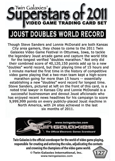 The Sanders-McDonald Joust card #127 is part of the LONNIE McDONALD JOUST HISTORY SERIES of cards sponsored by Lonnie McDonald, of Kansas City, MO.