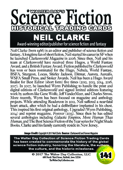 Neil Clarke (born 1966) is an editor and publisher of science fiction and fantasy. A longtime fan of short fiction, Neil started his career in SF when he launched Clarkesworld Magazine in 2006. Since then, Neil and his team at Clarkesworld have received three Hugos, a World Fantasy Award, and a British Fantasy Award. Fiction published by Clarkesworld has won or been nominated for the Hugo, Nebula, World Fantasy, BSFA, Sturgeon, Locus, Shirley Jackson, Ditmar, Aurora, Aurealis, WSFA Small Press, and Stoker Awards. Neil has been a Hugo Award finalist for Best Editor (short form) five times (2012, 2013, 2014, 2016, 2017). In 2007, he launched Wyrm Publishing to handle the print and digital editions of Clarkesworld and signed limited editions featuring work by authors like Gene Wolfe, Jeff VanderMeer, and Charles Stross. More recently, Wyrm has been focused on magazine and anthology projects. While attending Readercon in 2012, Neil suffered a near-fatal heart attack, after which he had a defibrillator implanted in his chest. This inspired his first original anthology, Upgraded (Wyrm Publishing, 2014) and reprint magazine, Forever (2015). Since then he has edited several anthologies including Galactic Empires, More Human Than Human, and The Best Science Fiction of the Year series for Night Shade Books. Clarke and his family currently reside in New Jersey.