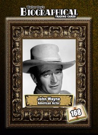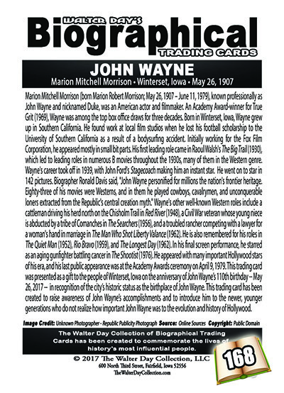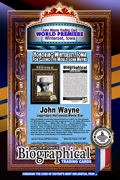 This TRADING CARD AWARD was presented as a gift to the people of Winterset, Iowa on the anniversary of John Wayne’s 110th birthday -- May 26, 2017 -- in recognition of the city’s historic status as the birthplace of John Wayne. This trading card has been created to raise awareness of John Wayne’s accomplishments and to introduce him to the newer, younger generations who do not realize how important John Wayne was to the evolution and history of Hollywood.