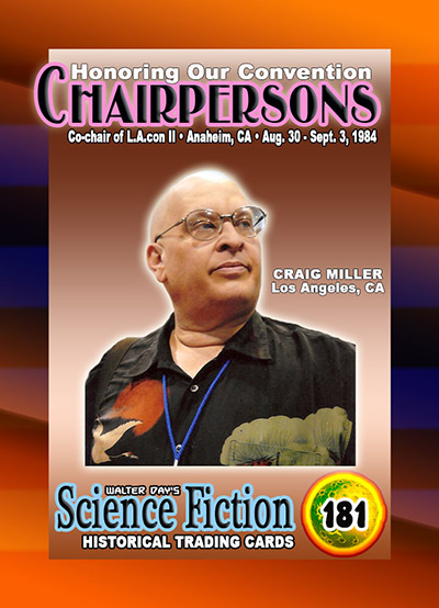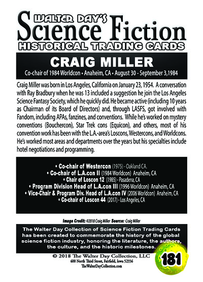 This card and award were unveiled at Worldcon 76, on FrIday, August 17, 2018, at the San Jose McEnery Convention Center. This card was created in recognition of Craig Miller's immense contributions to the science fiction community.