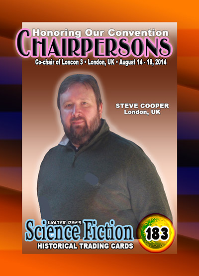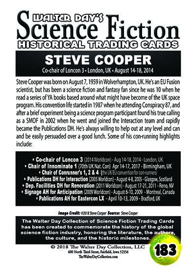 This card and award were unveiled at Worldcon 76, on FrIday, August 17, 2018, at the San Jose McEnery Convention Center. This card was created in recognition of Steve Cooper's immense contributions to the science fiction community.