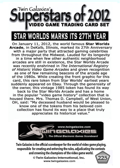 This card is among the series that commemorate historical events or individuals associated with the noted Star Worlds Arcade, in DeKalb, IL.